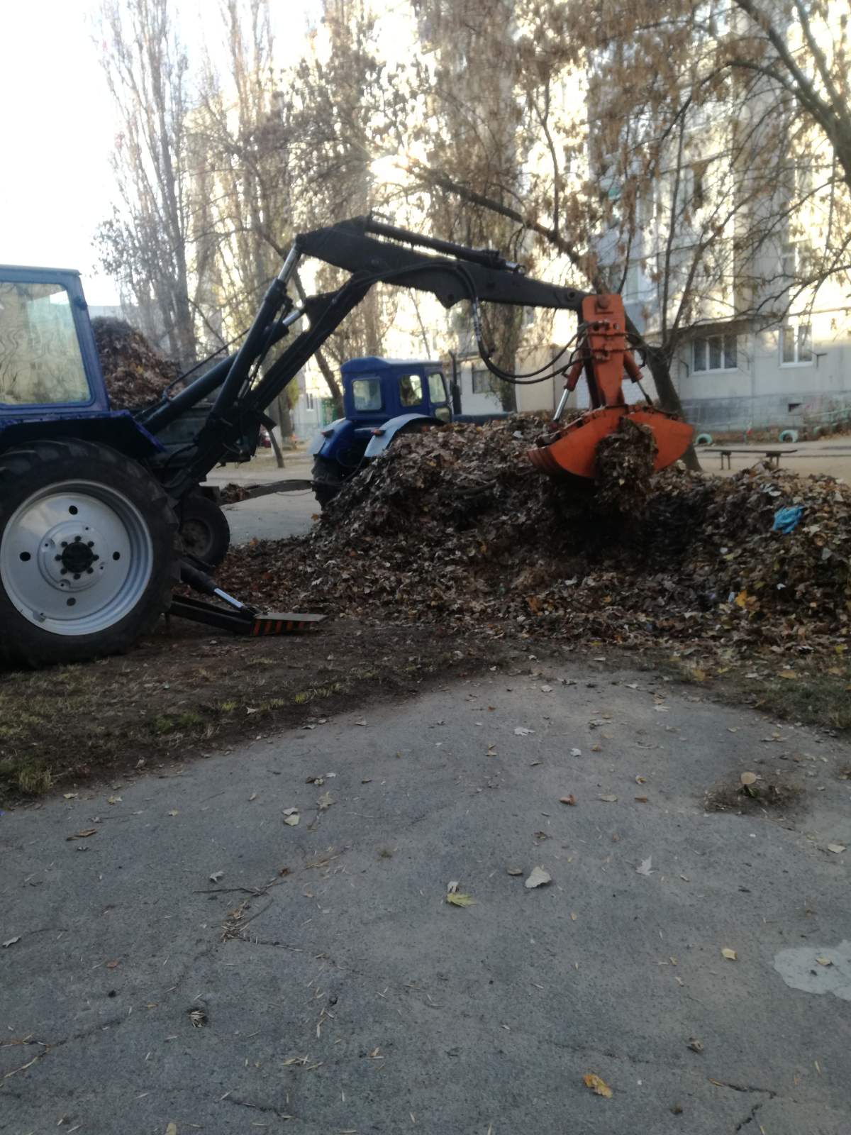 Продовжується вивезення опалого листя на масиві Леваневського. На фото процес погрузки листя на 3 мікрорайоні (Леваневського, 47/1, пров. Героїв Крут, 32А перший).